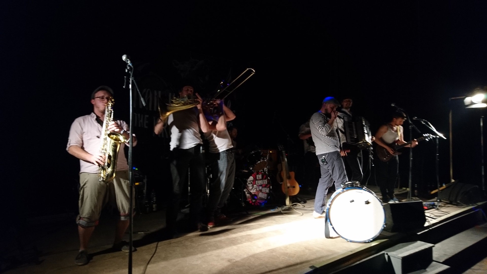 Wir freuten uns auf die Band Ivan Ivanovich & The Kreml Krauts, die ab 21.00 Uhr mit ihrer Musik nicht nur die allerletzten Winterüberbleibsel vertrieben. Die treibenden Polkarhythmen, kreiert von Schlagzeug, Bass und Gitarre vermischten sich mit herzerweichenden Melodien von Akkordeon, Horn, Saxophon und Posaune zu einem einzigartigen Klangerlebnis. Darauf zeichnet Sänger Ivan Ivanovich mit seiner wodkagetränkten Stimme wunderschöne Kunstwerke voller Trauer und Schmerz, die jeden Konzertbesucher innerlich erwärmten – und am Ende allen klar war, was die russische Seele ausmacht.